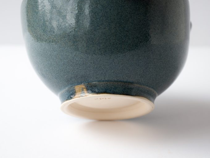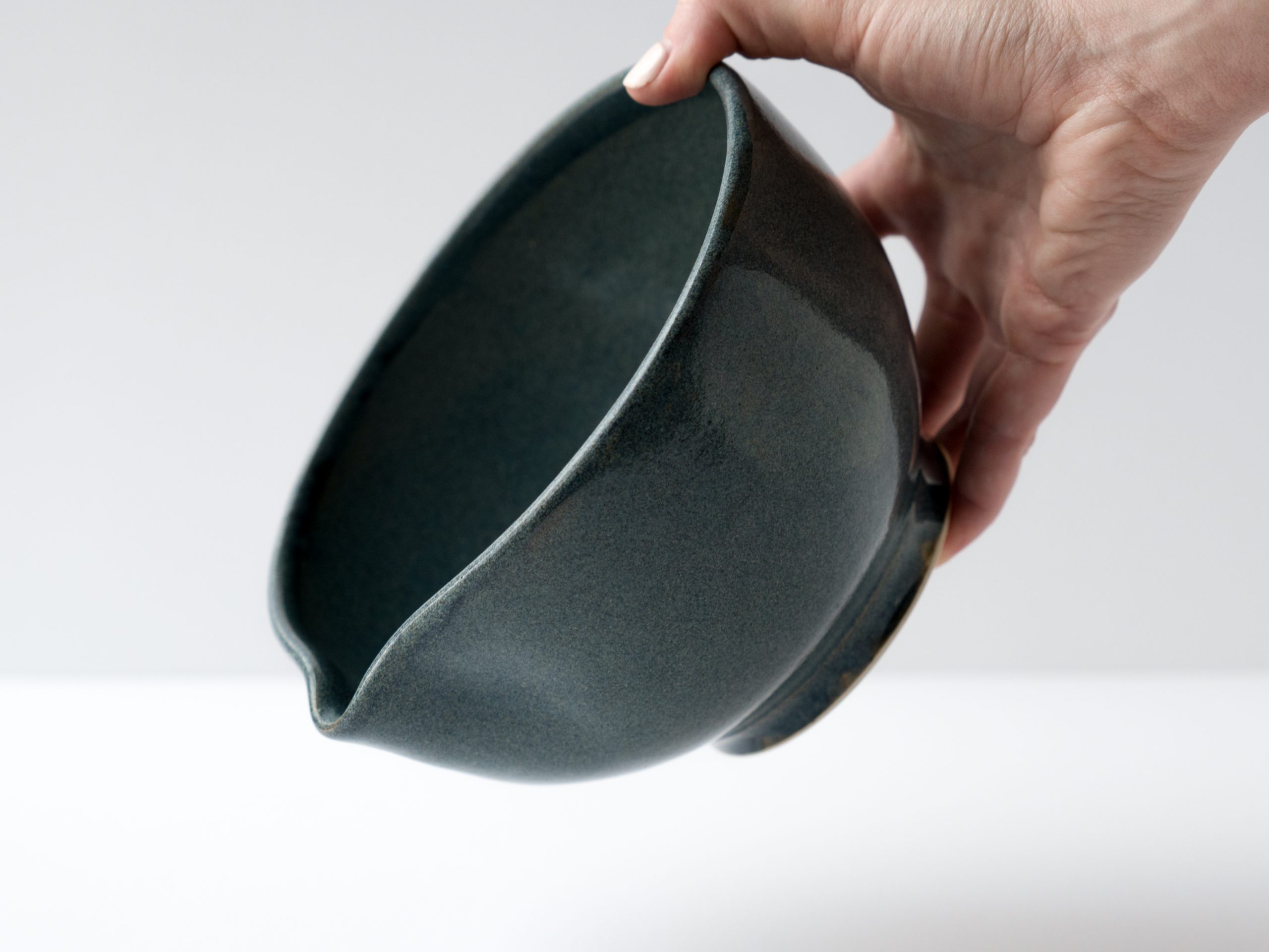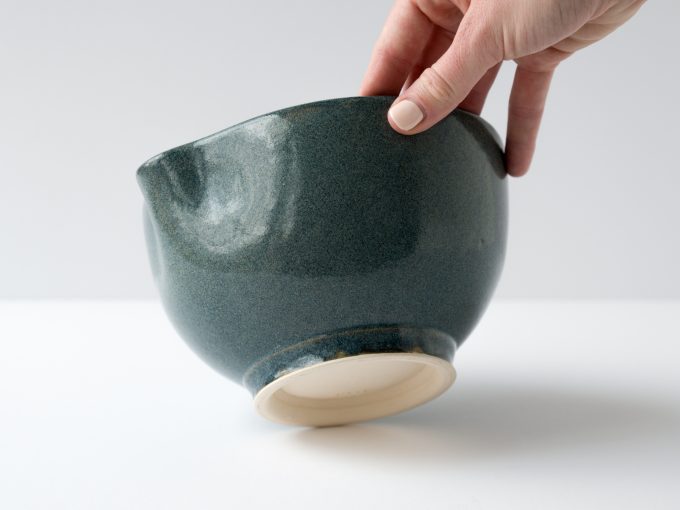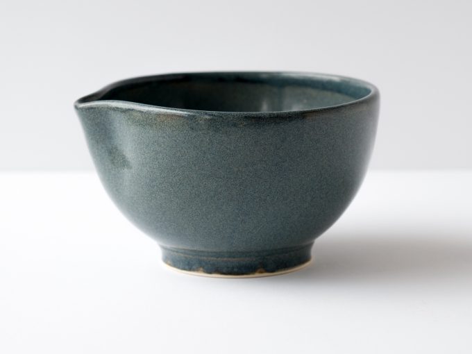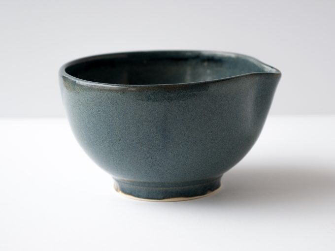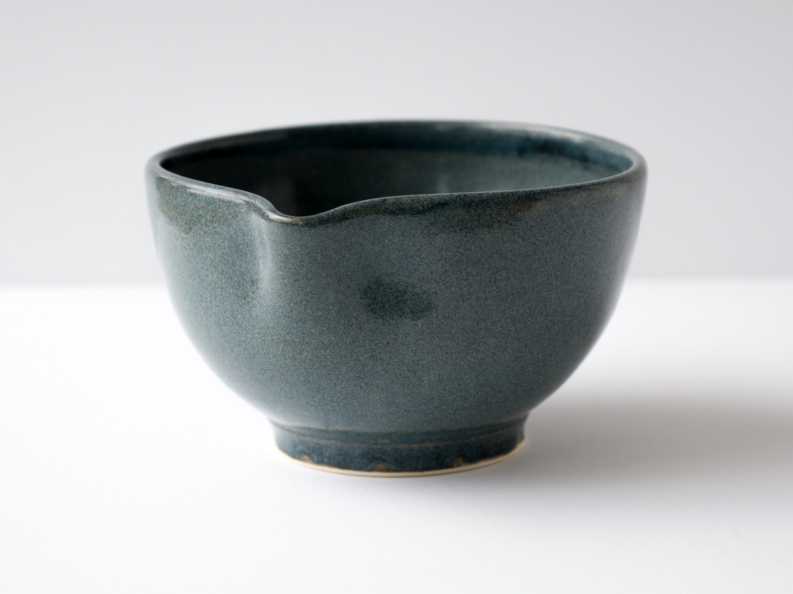 Wheel thrown blue bowl with spout for pouring. Variegated blue glaze.