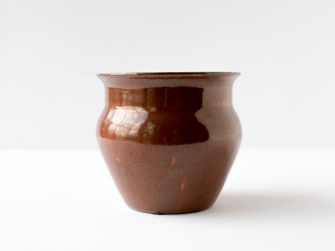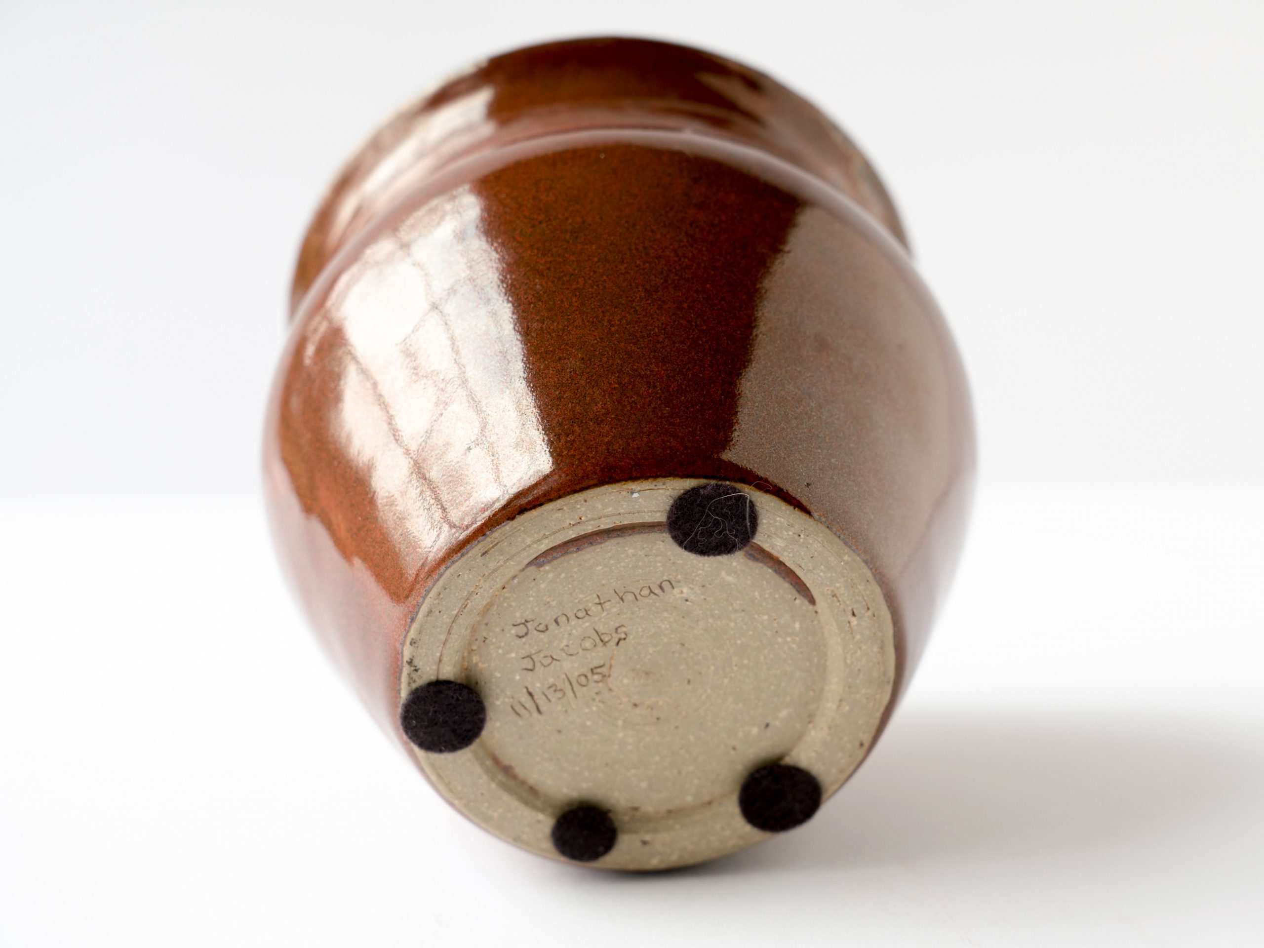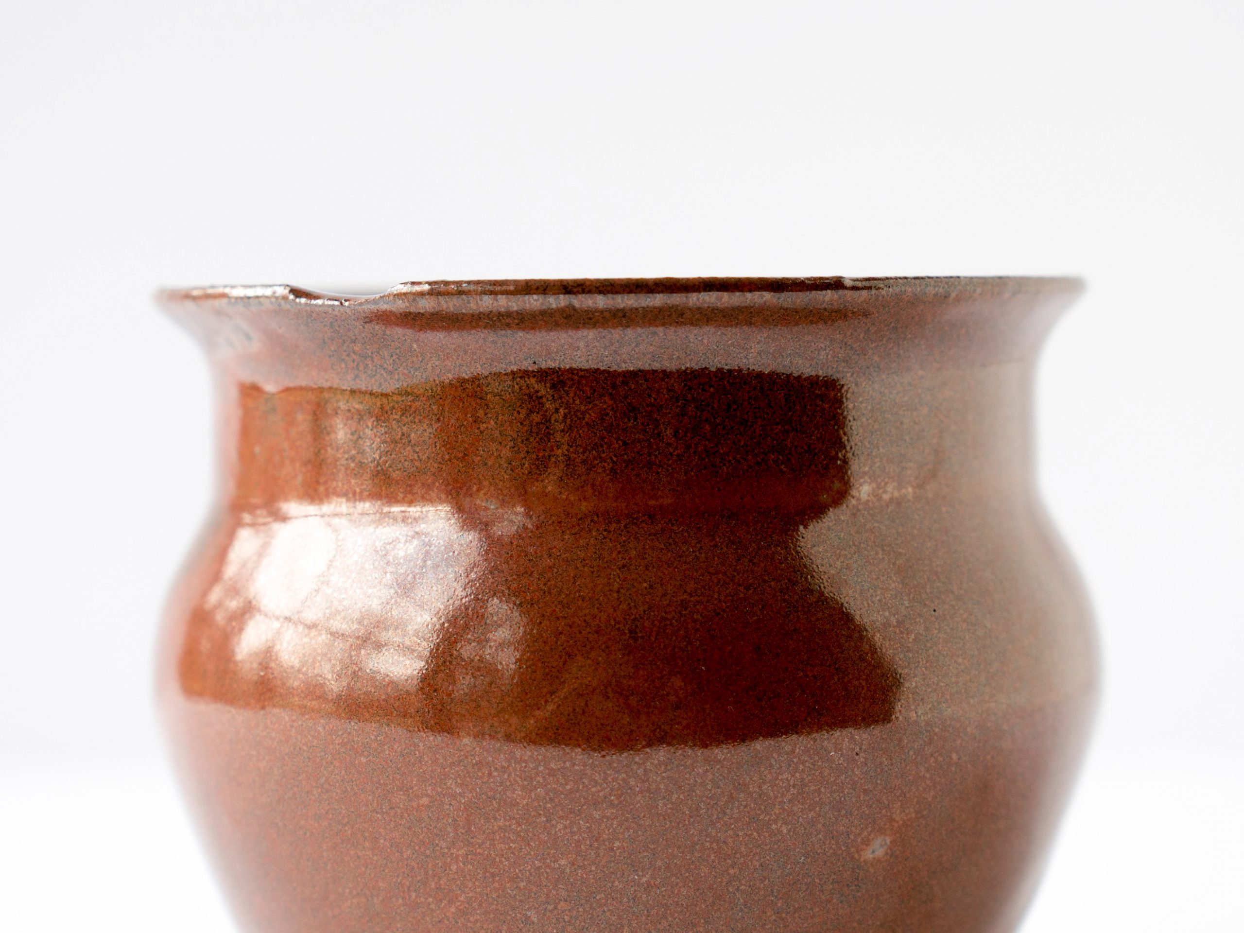 Flower or plant pot wheel thrown on 11/13/2005. Small chip at top and felt pads on bottom. Reddish brown glaze.