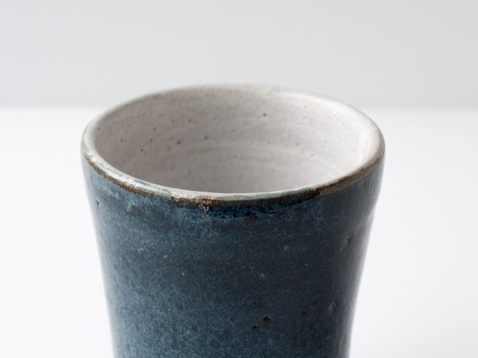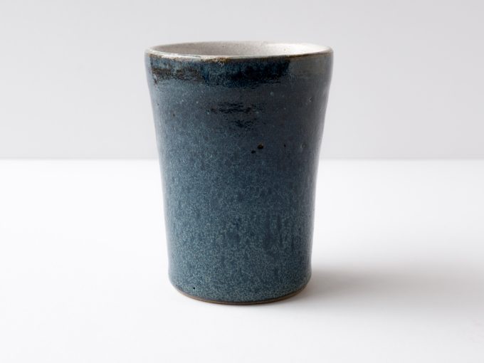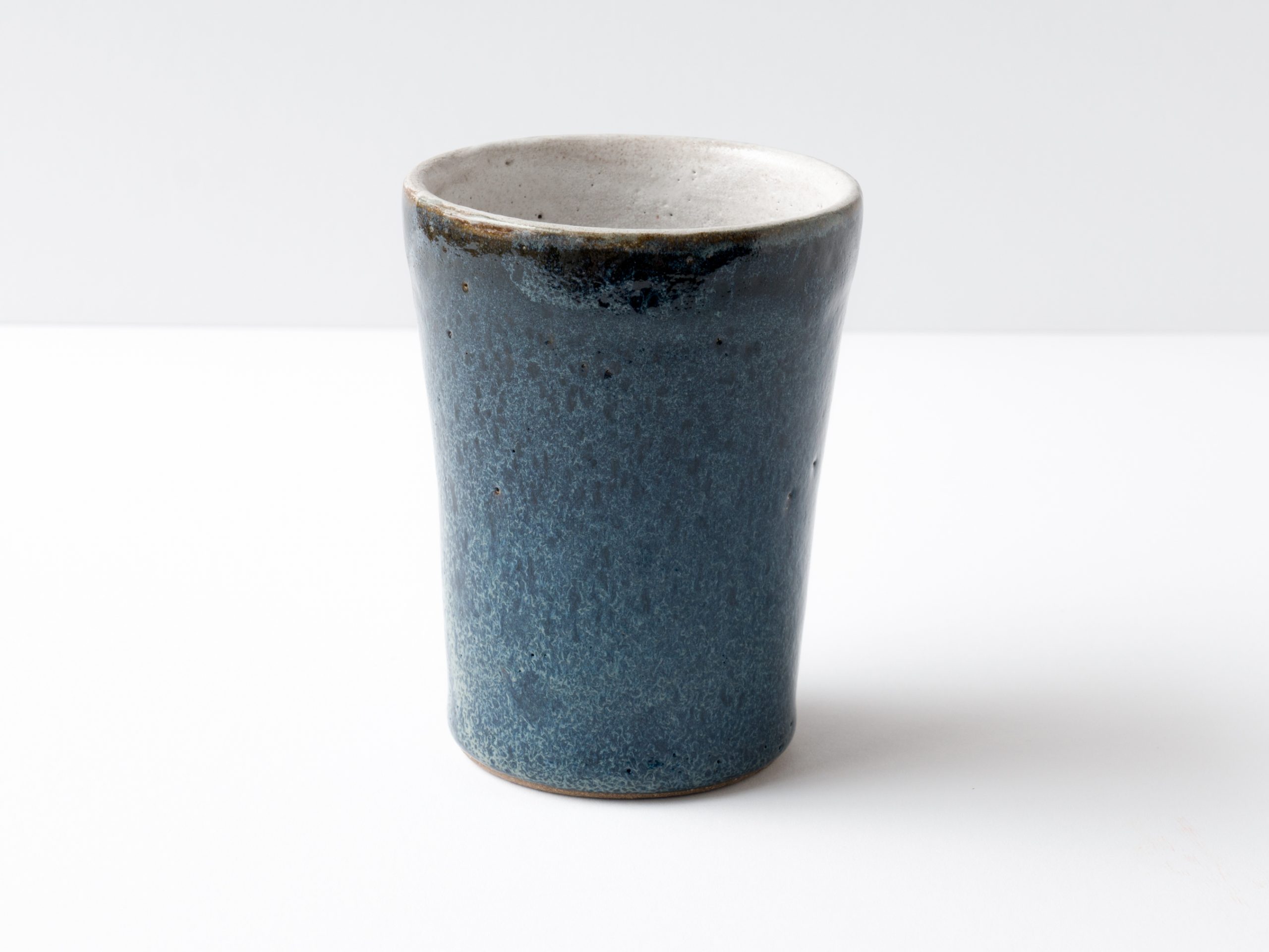 Wheel thrown blue cup. Sized well for water or a cocktail. Variegated blue glaze on outside with white oil spot glaze on inside.