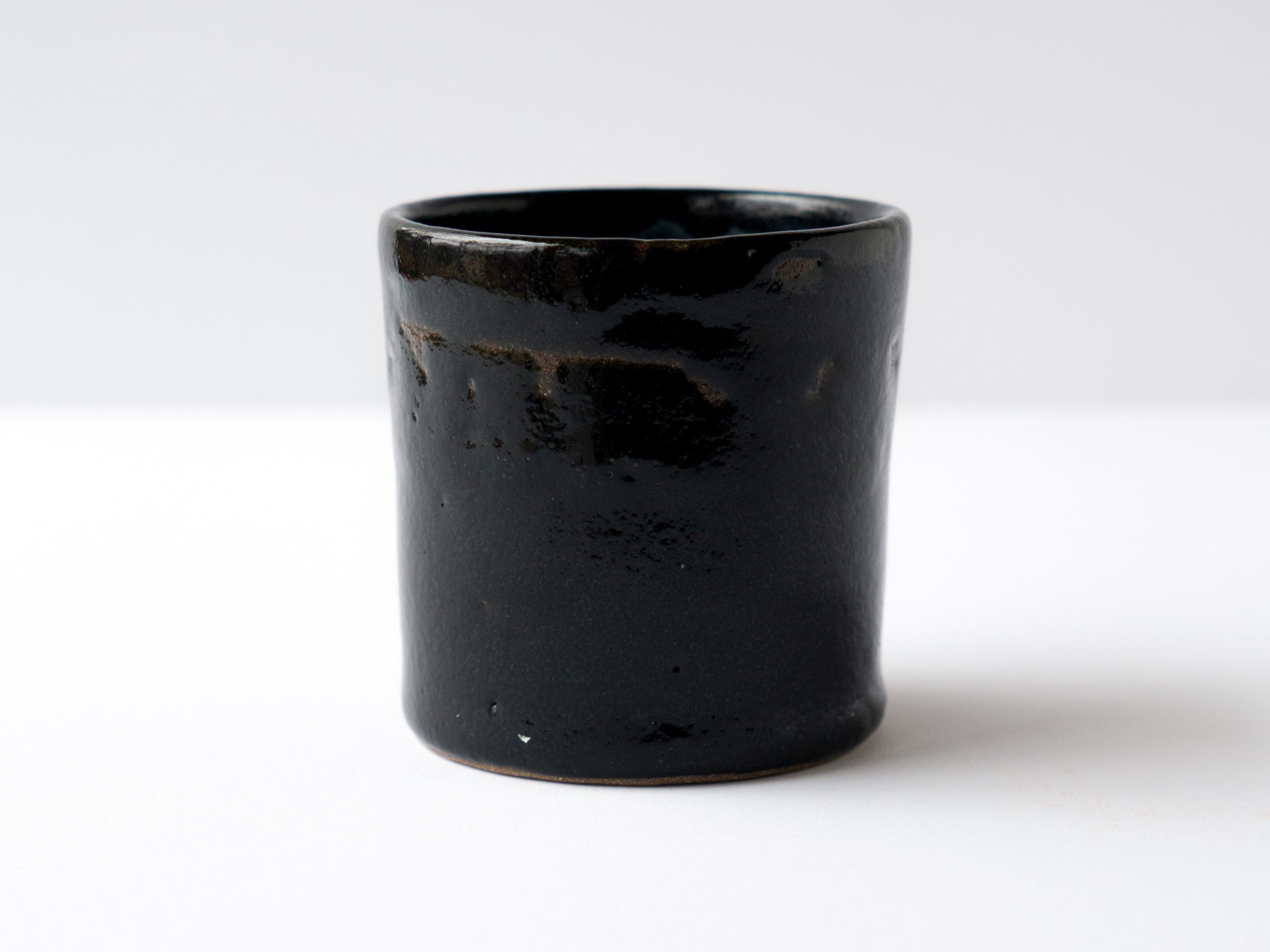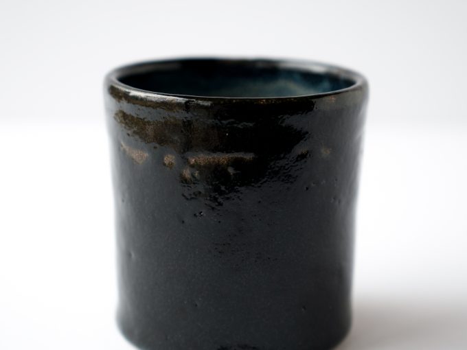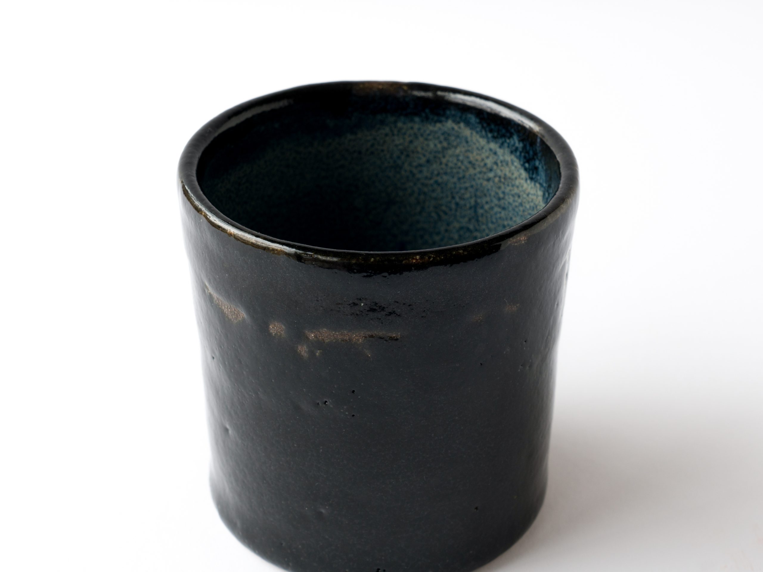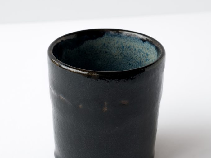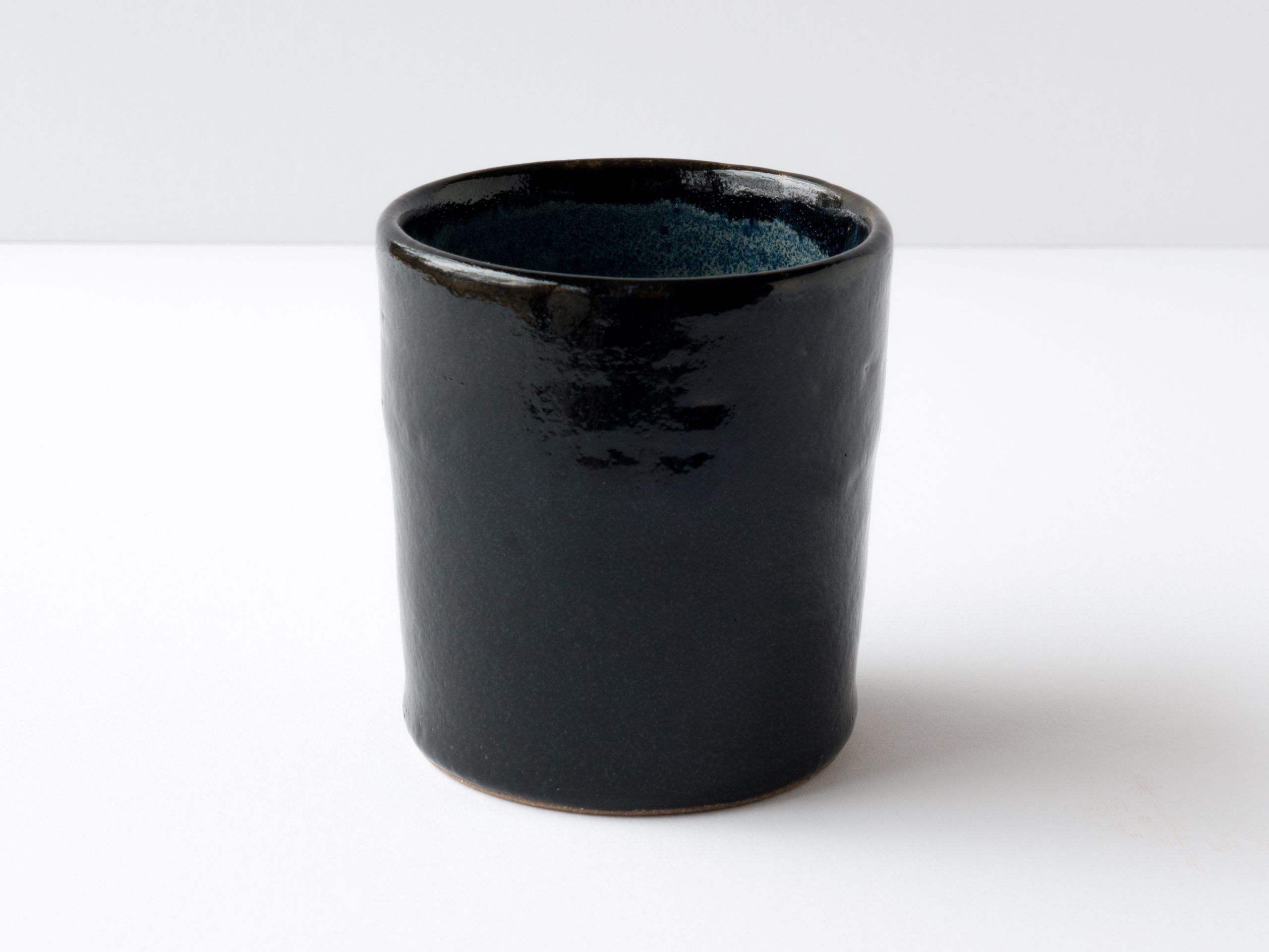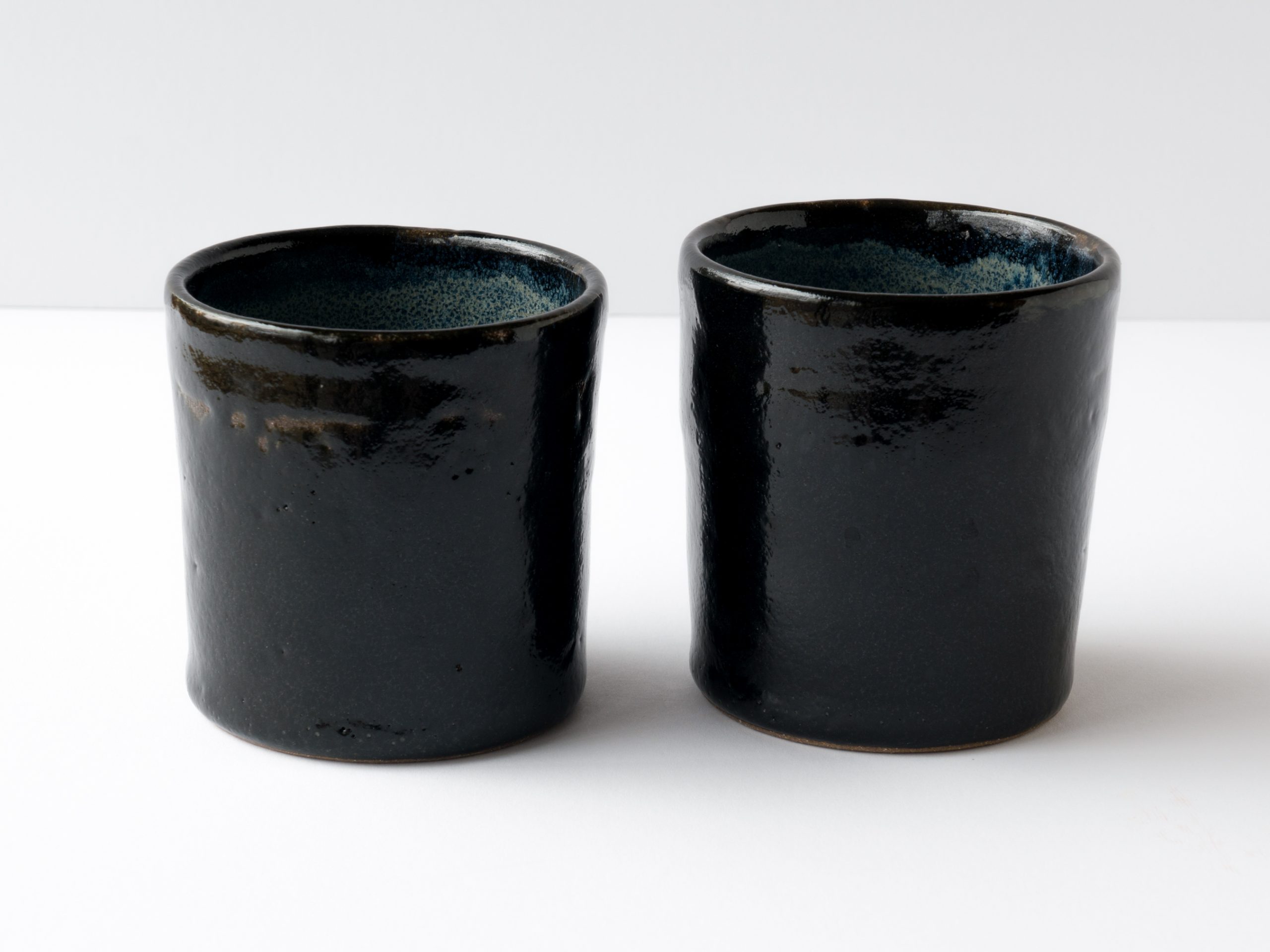 Wheel thrown black cups. Sized well for water or a cocktail. Licorice black glaze on outside with variegated blue glaze on inside of cups.