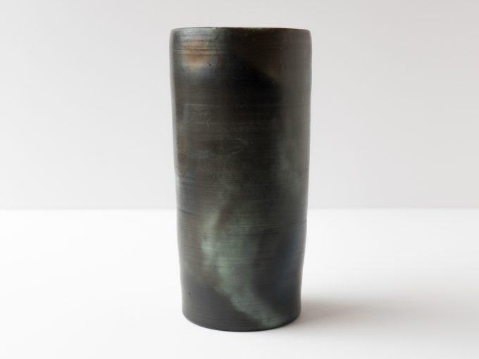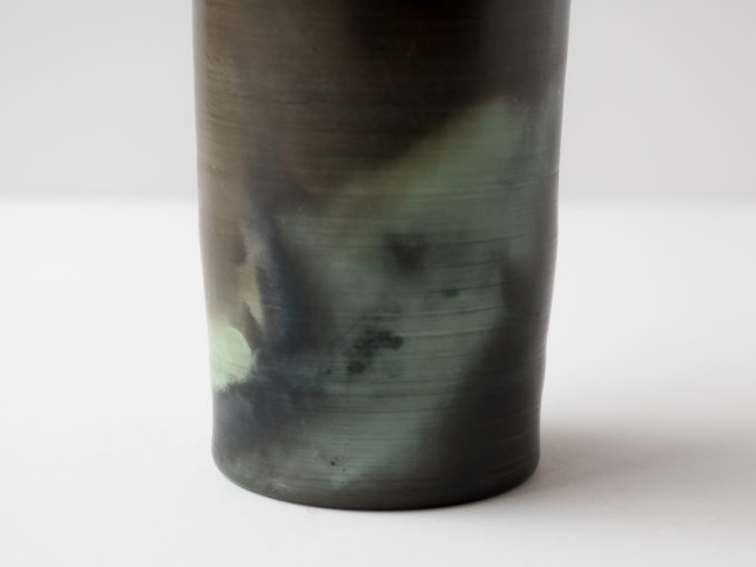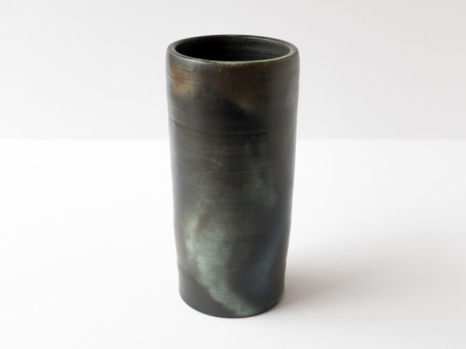 Wheel thrown vase/utensil holder. Dark green terra sigillata glaze is sawdust fired.
