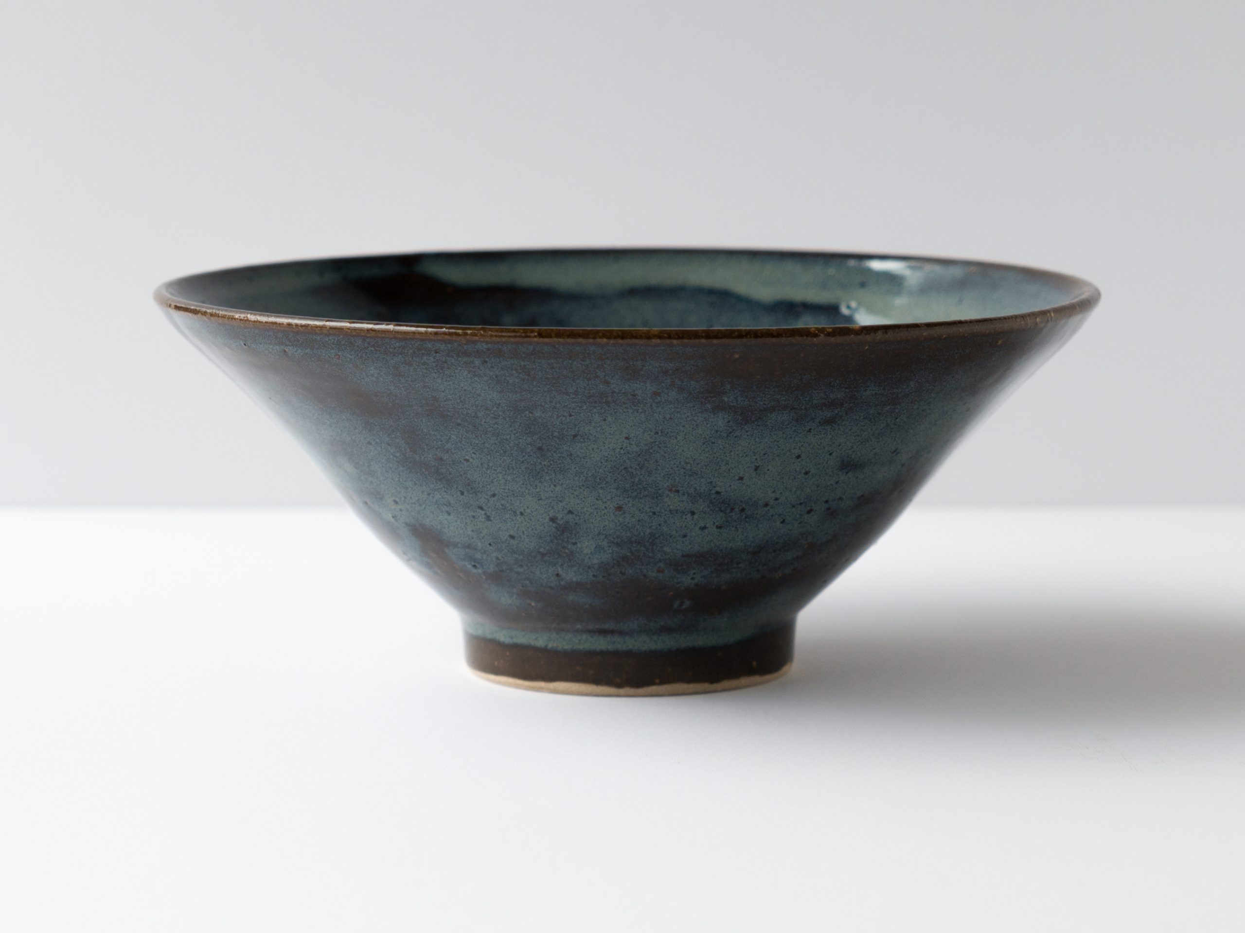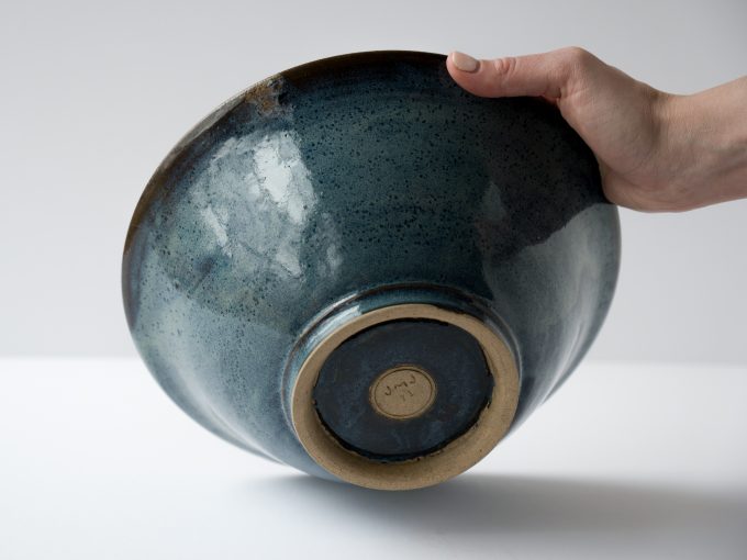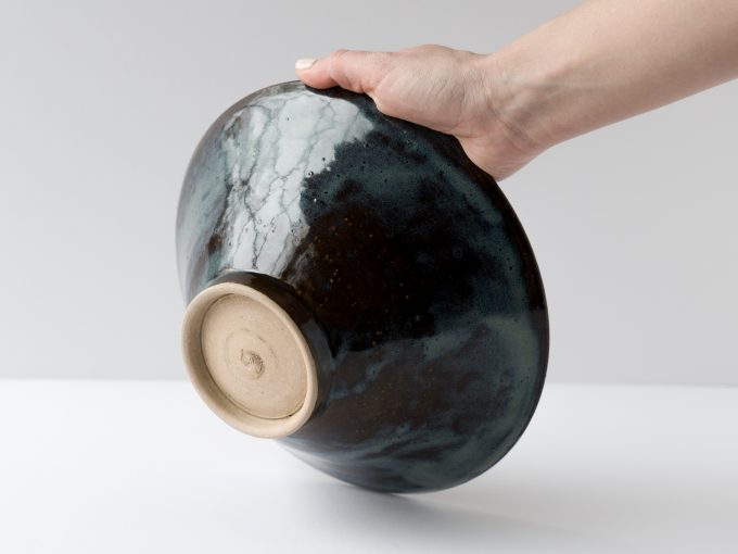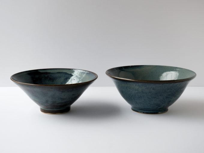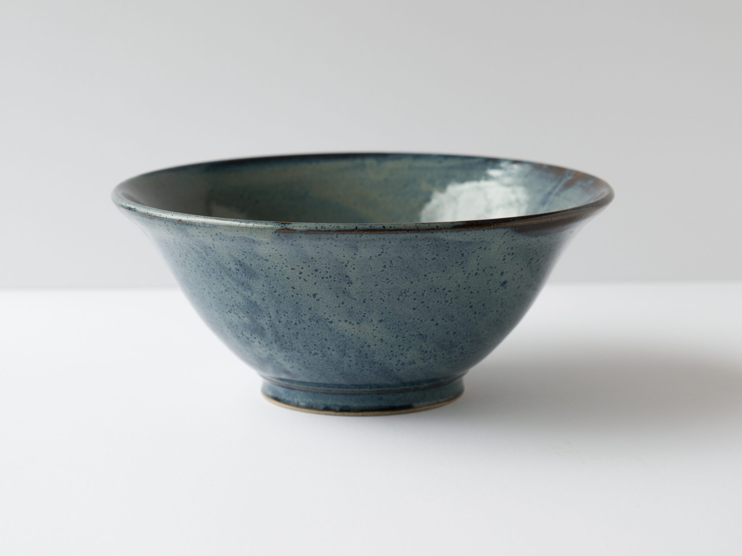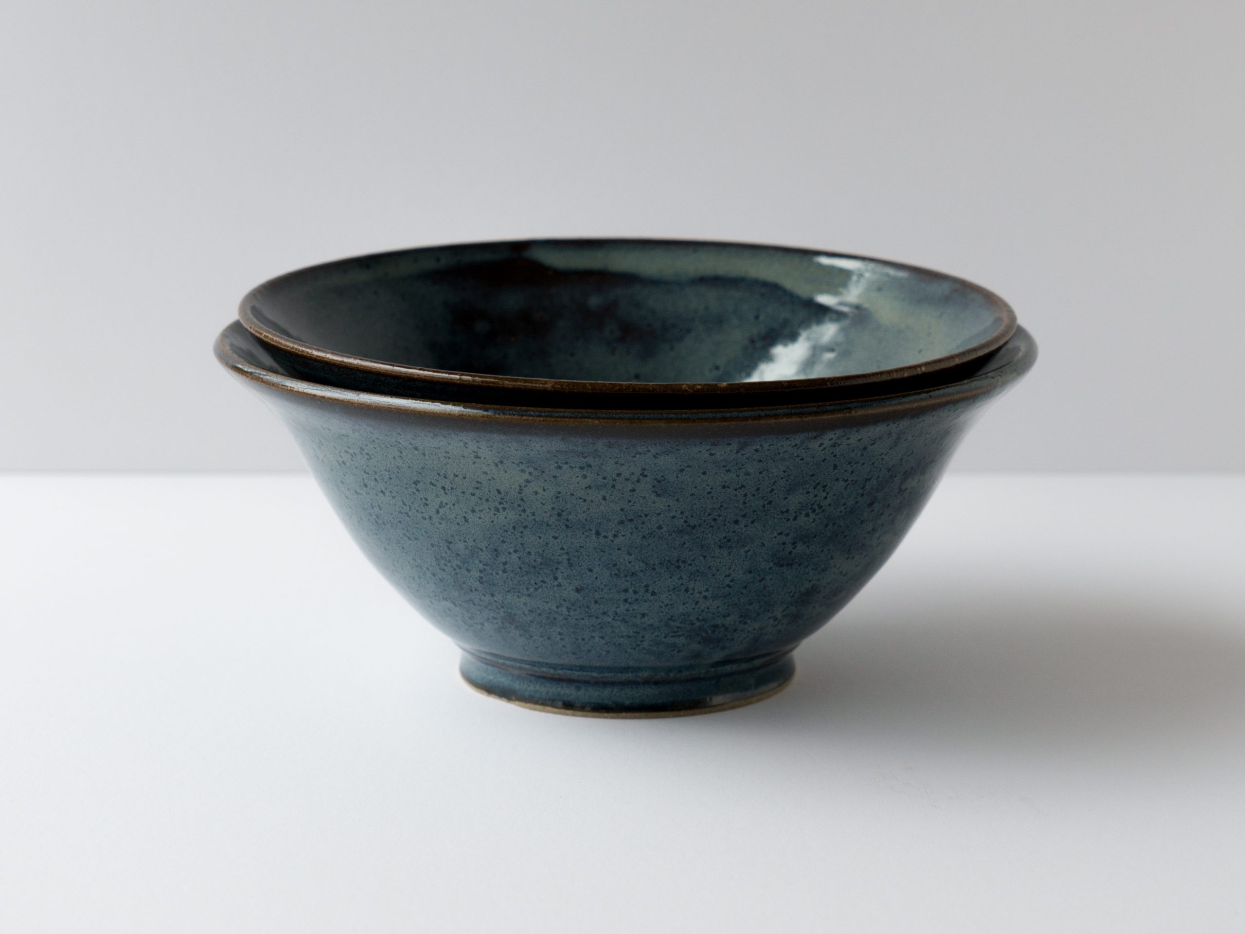Set of two handmade ceramic bowls. Sized well for ramen, salad, noodles, or a big helping of Lucky Charms. This set includes two stackable bowls with a variegated blue glaze.