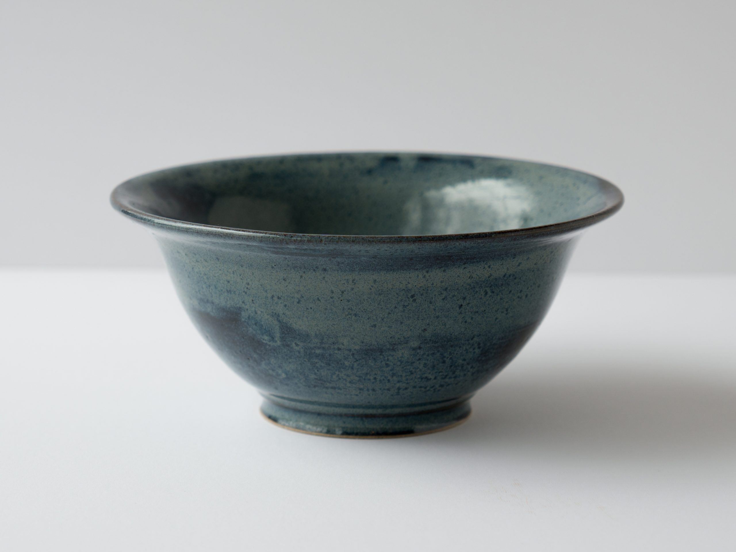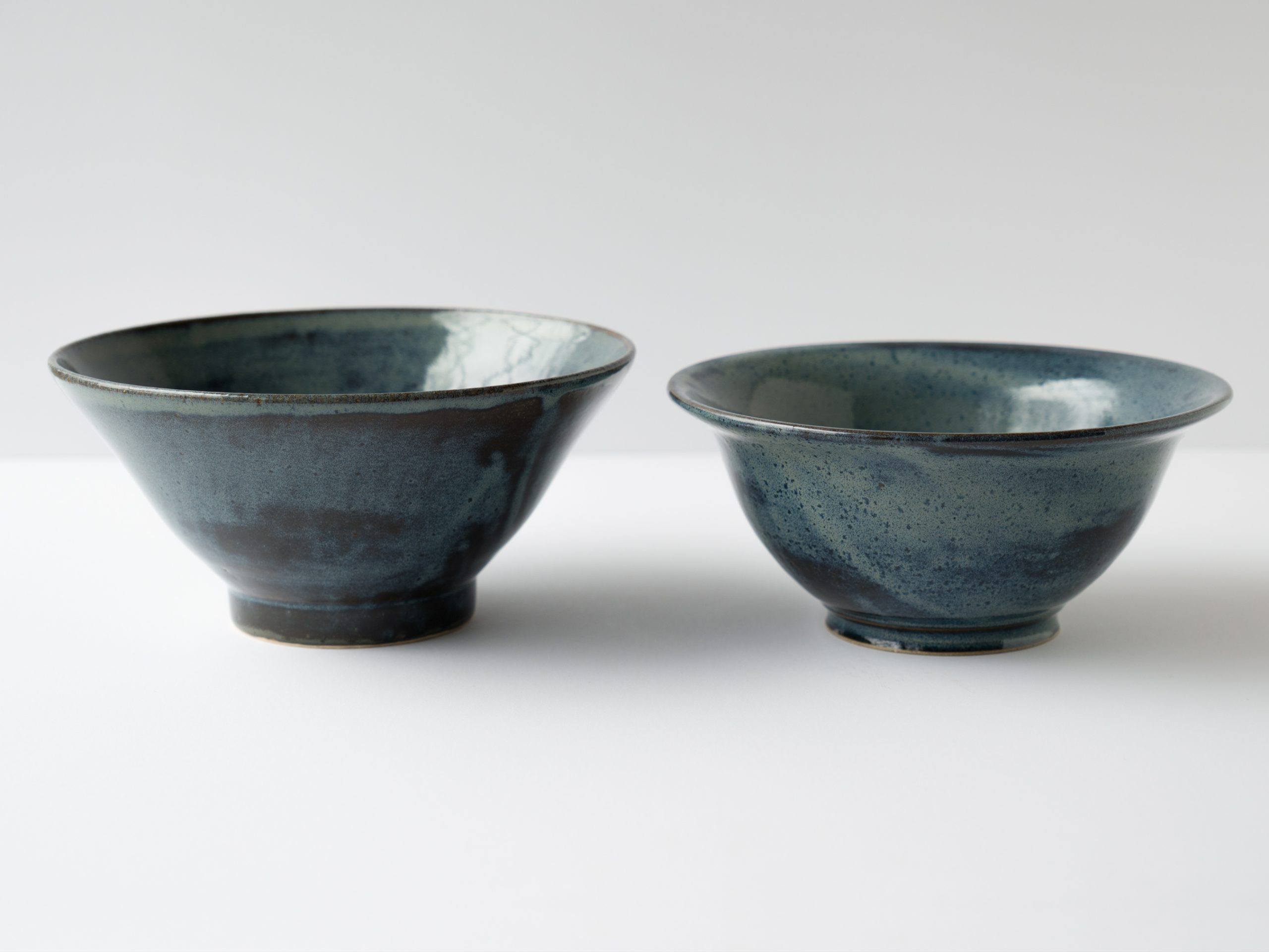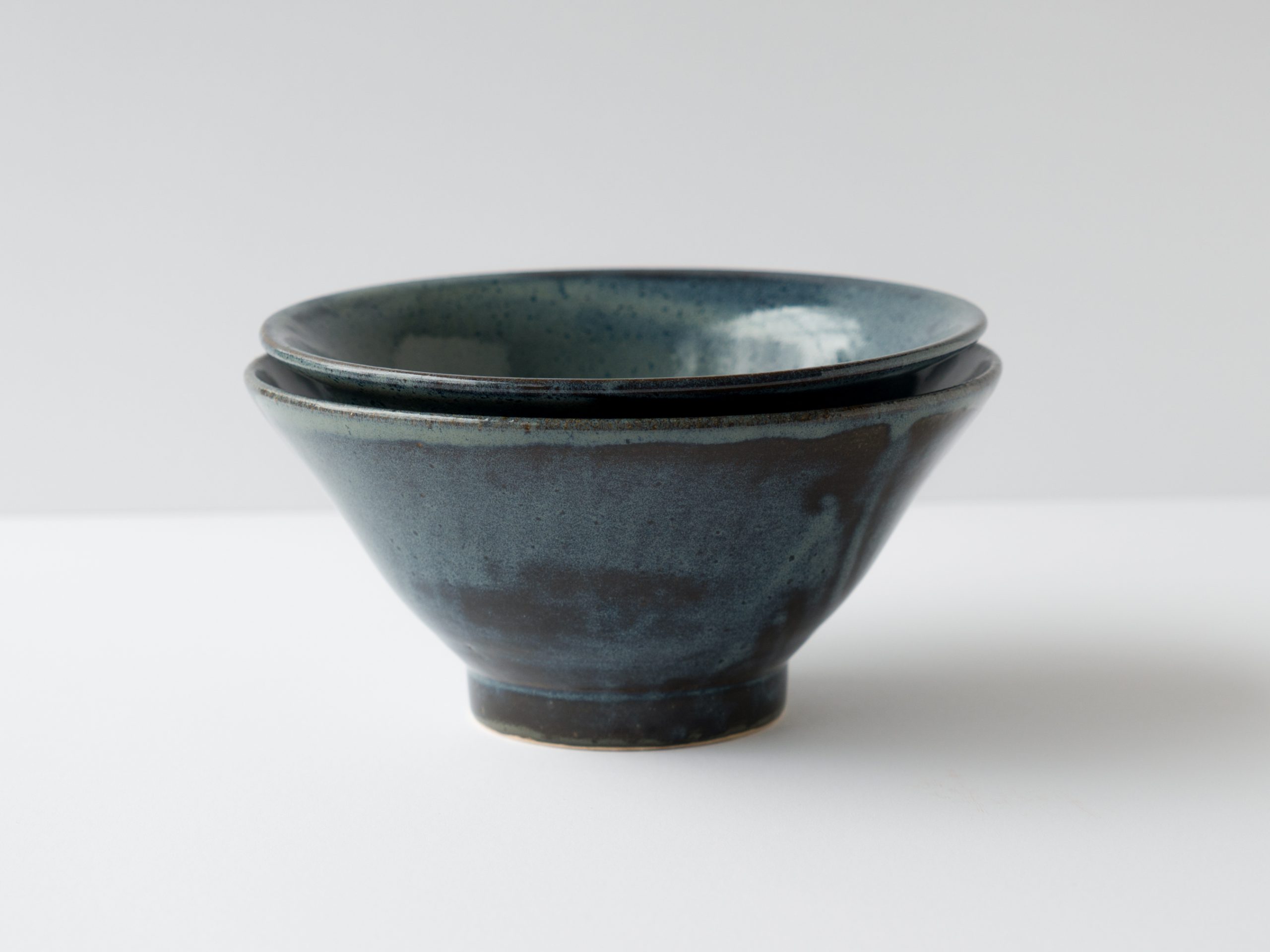 Set of two handmade ceramic bowls. Sized well for salad, noodles, soups, or a big helping of Lucky Charms. This set includes two stackable bowls that with a variegated blue glaze.