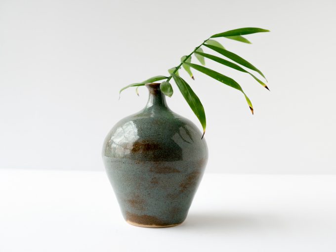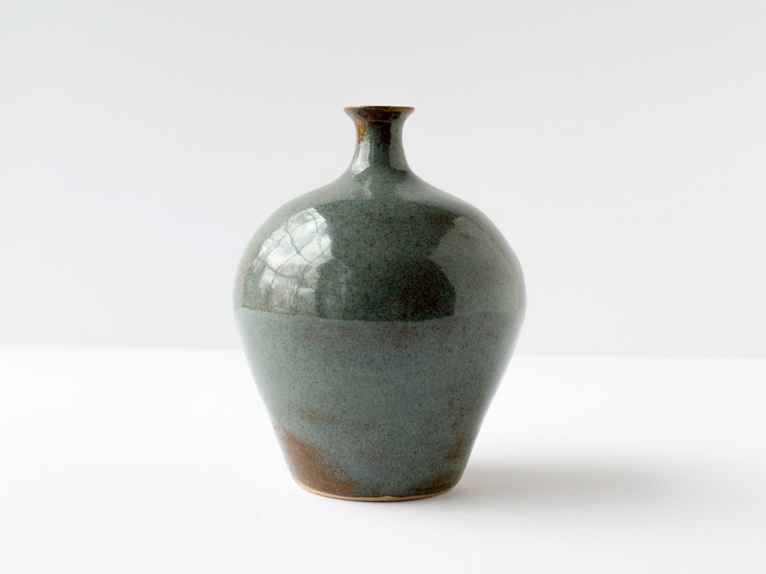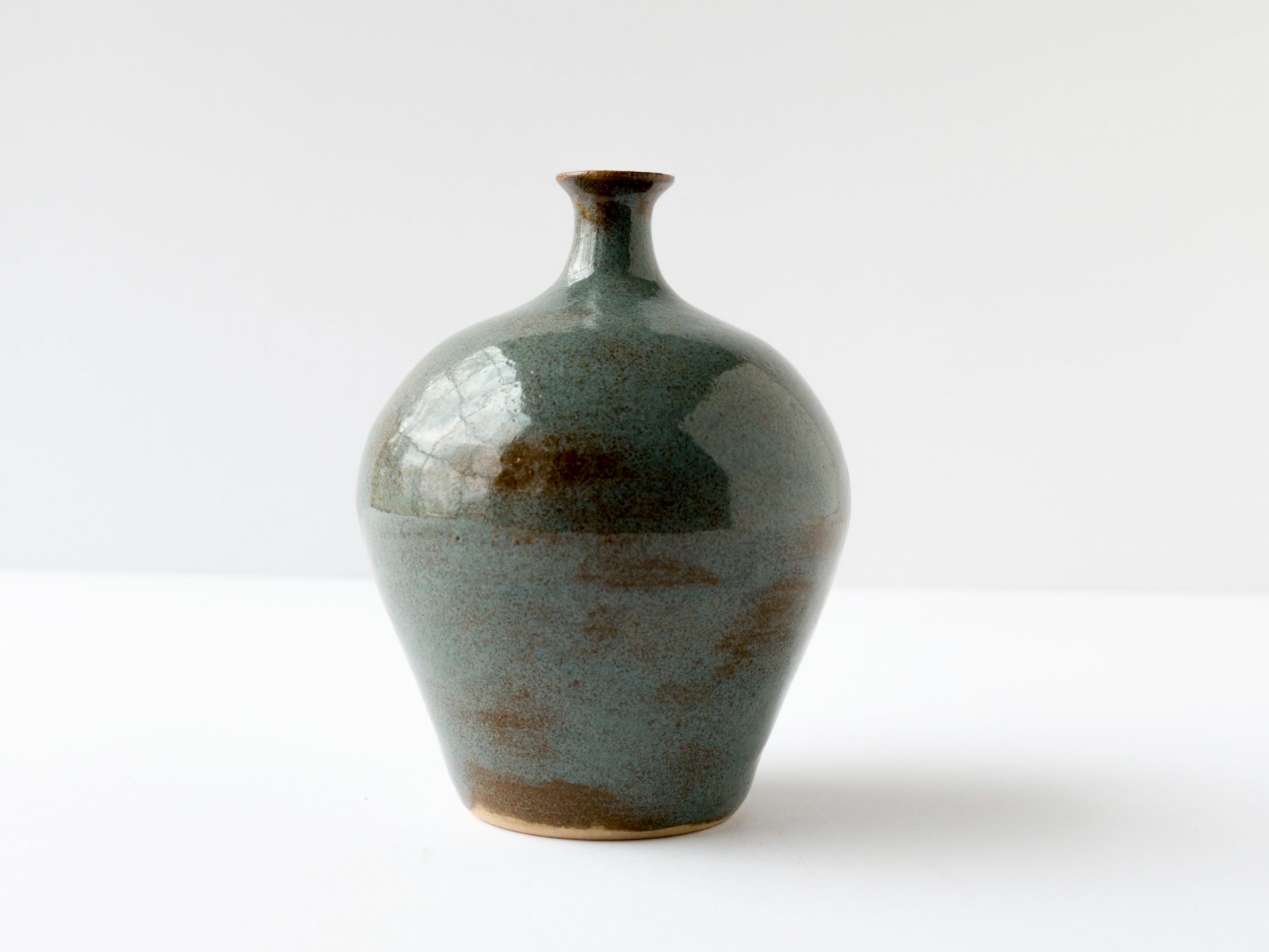 Wheel thrown bud or flower vase. Variegated blue glaze.