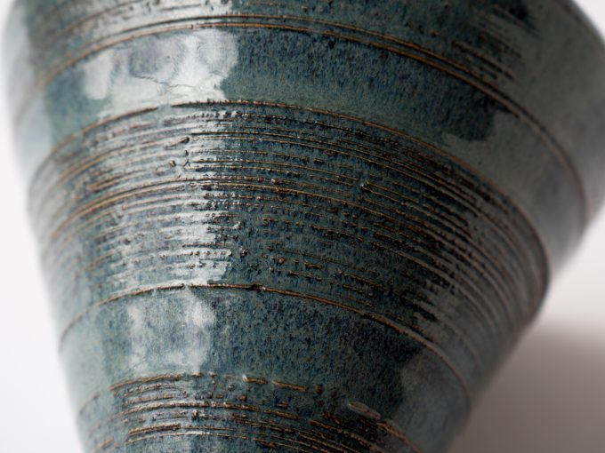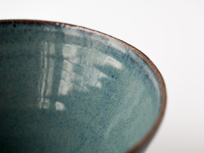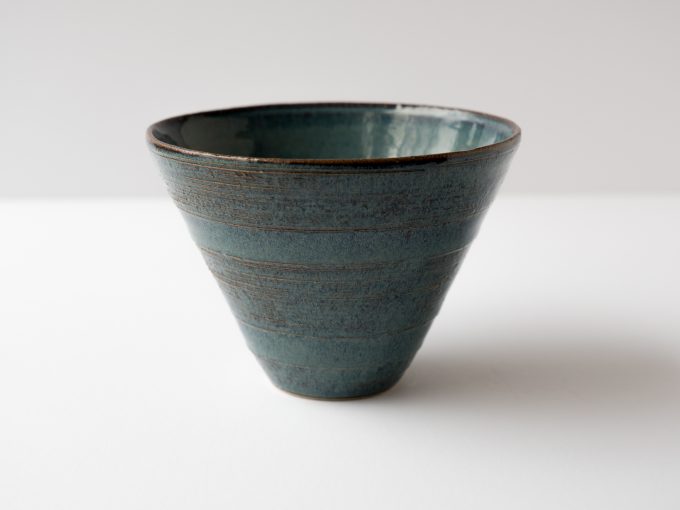 Wheel thrown bowl sized well for chips or popcorn. Variegated blue glaze.