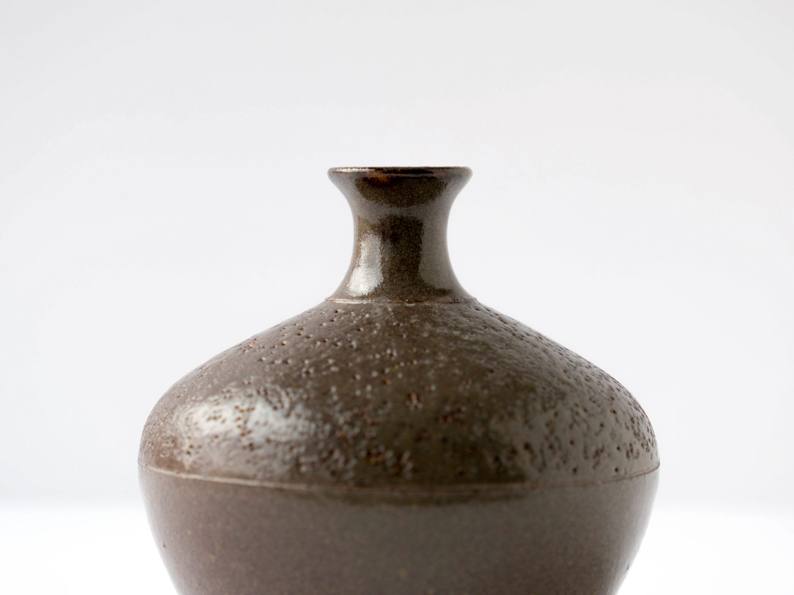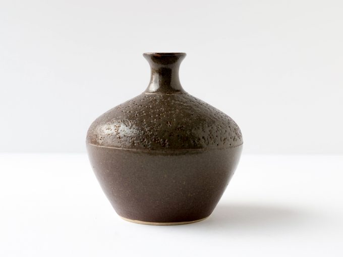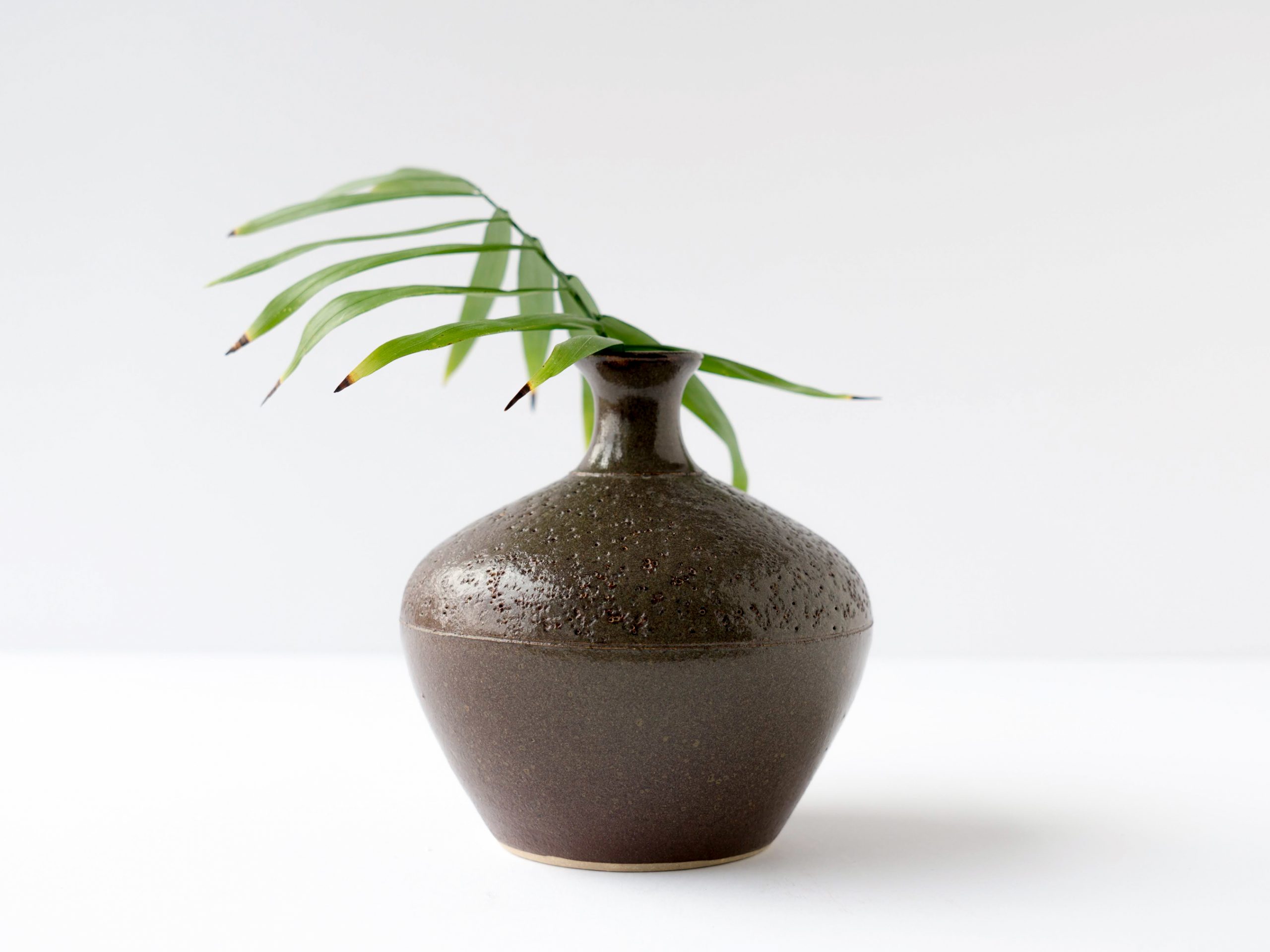 Wheel thrown vase with linework design. Opening smaller than 1″ is sized well for small flowers and buds. Brown glaze.