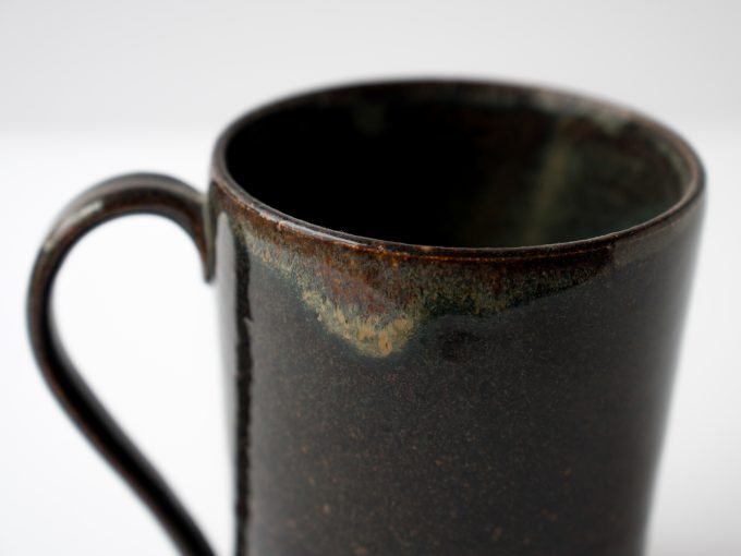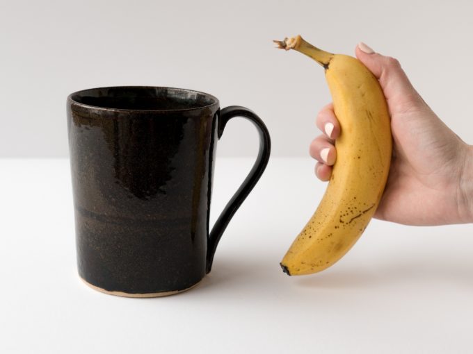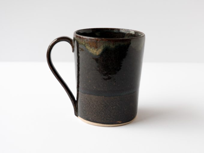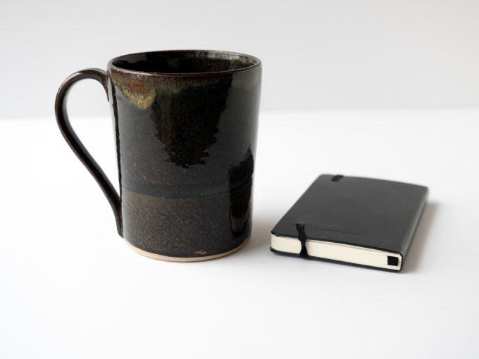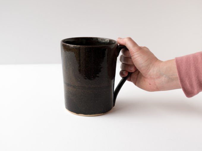 Wheel thrown brown mug with handle. 24oz capacity—this is a big boy (banana for scale). Waterfall brown glaze.