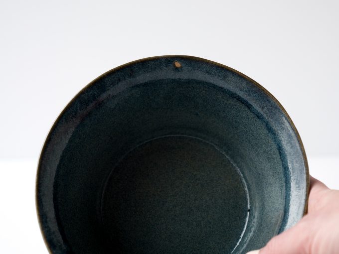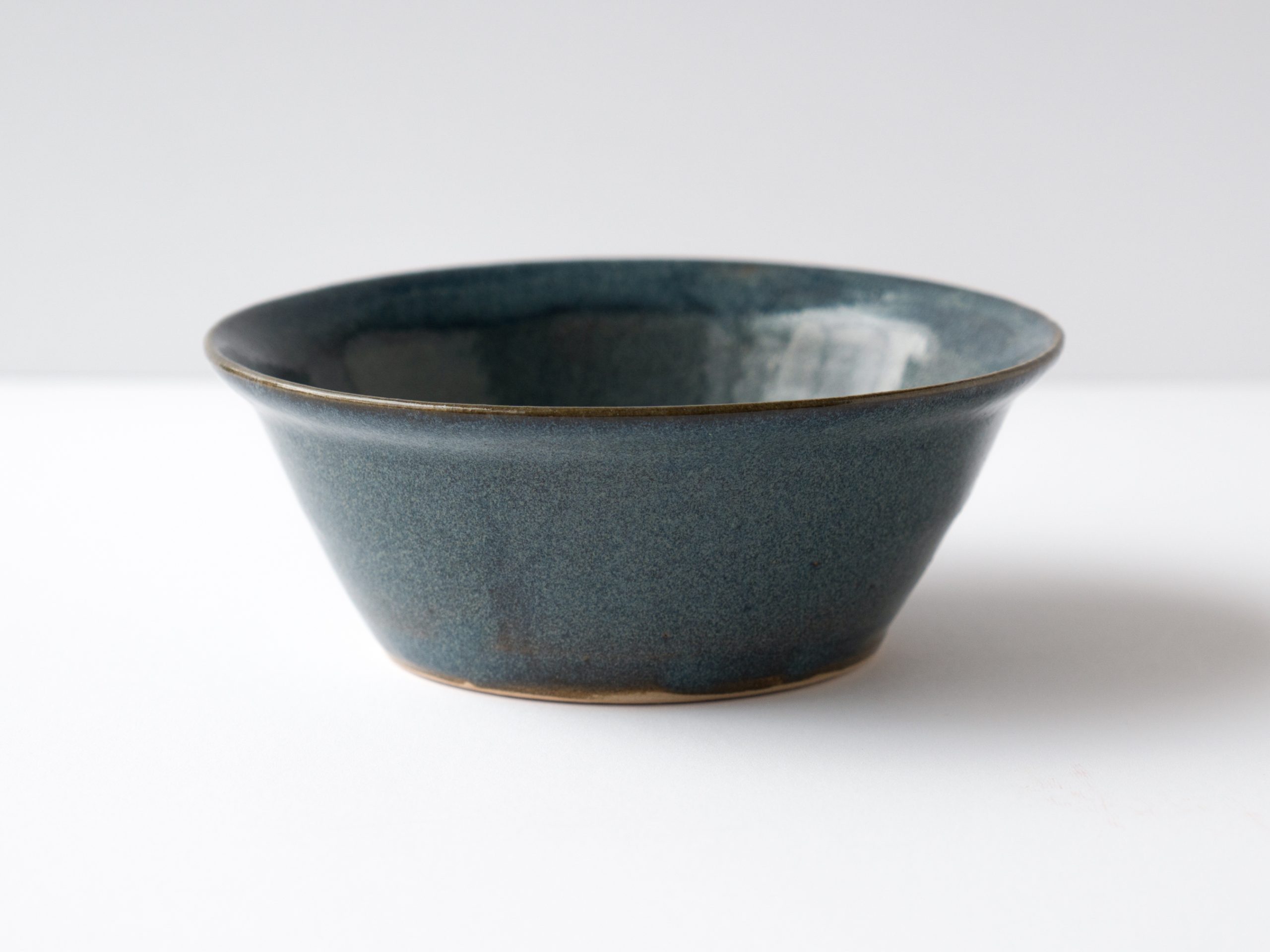 Wheel thrown blue bowl. Sized well for a fruit or a serving bowl. Variegated blue glaze. See detail photos for minor blemish in glaze.