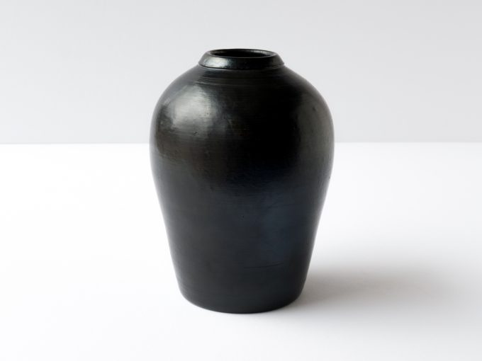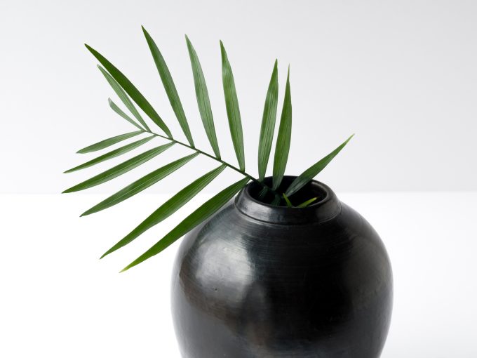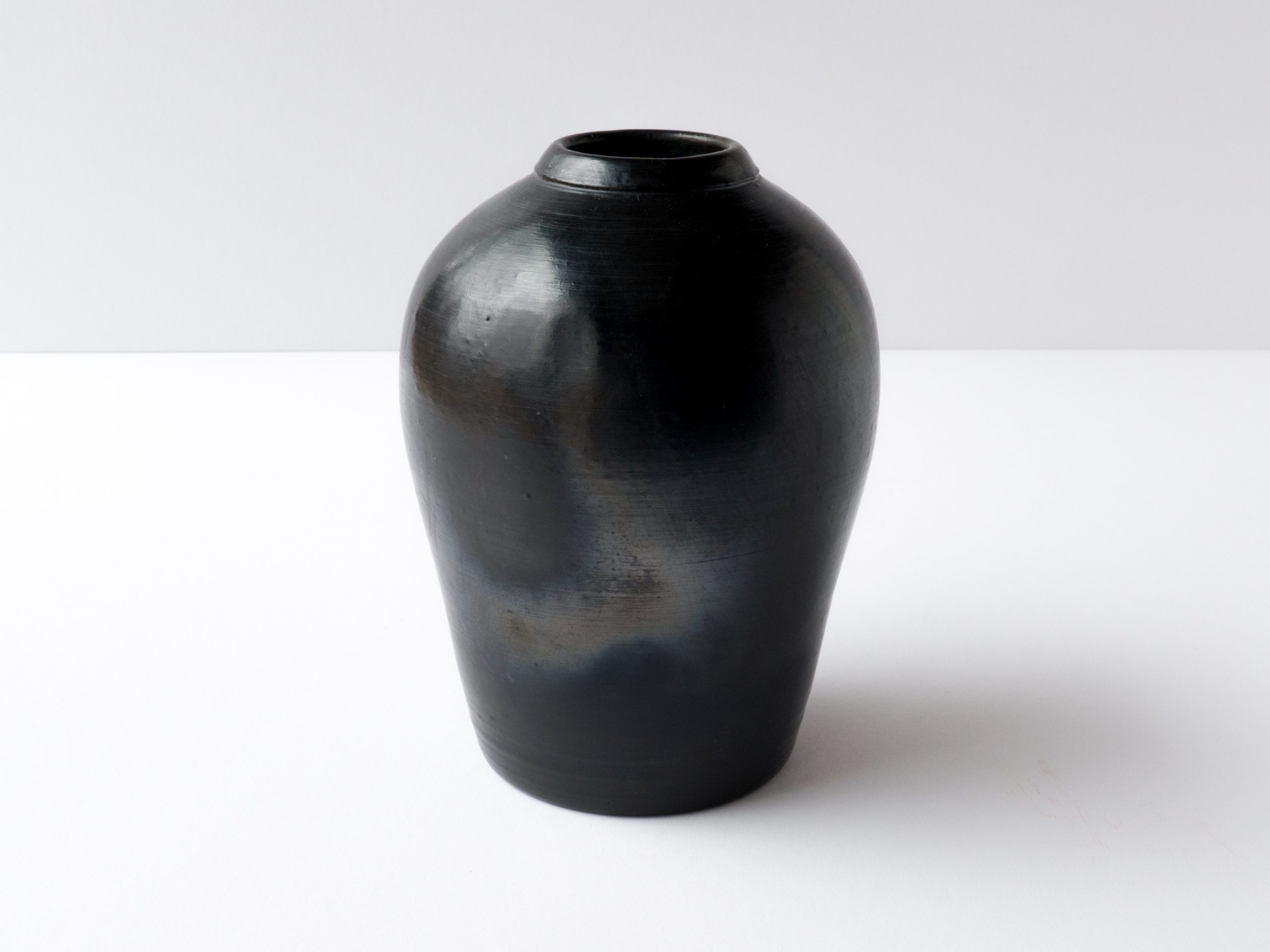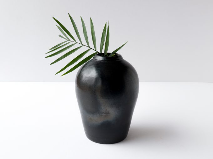Wheel thrown very dark green/black vase. Opening smaller than 2″ is sized well for small flowers and buds. Green terra sigillata glaze is sawdust fired.