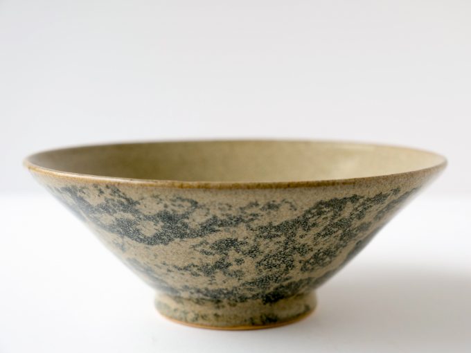 Wheel thrown bowl with mottled design on outside. Nutmeg red glaze fired to more of a yellow ocher color.