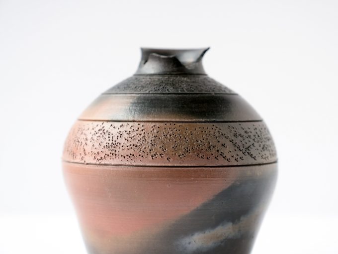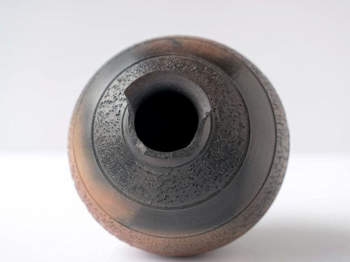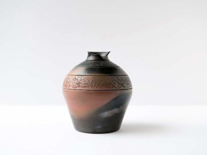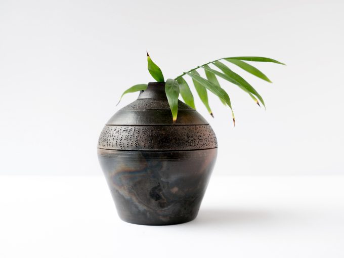 Wheel thrown terra cotta/black vase with linework detail. Opening smaller than 2″ is sized well for small flowers and buds. Terra sigillata glaze is sawdust fired. *Top of vase is broken but vase is beautiful so we’re listing regardless as it could still work well with buds/dried flowers.*