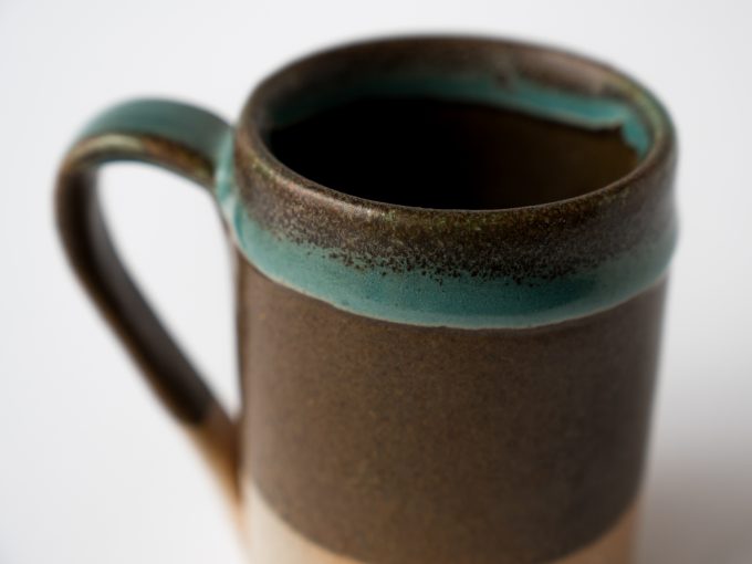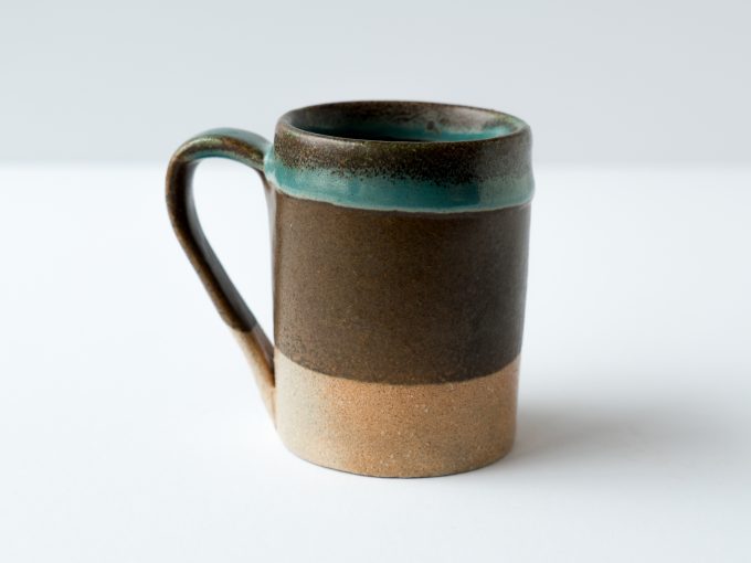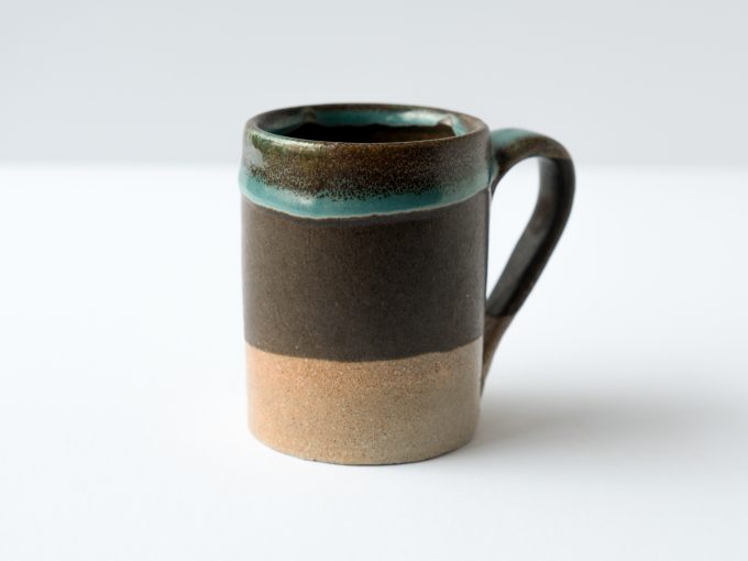 Wheel thrown soda fired mug with handle. UNL glaze.