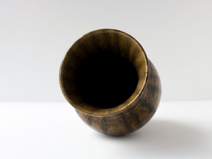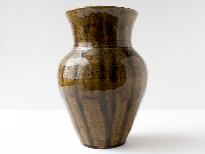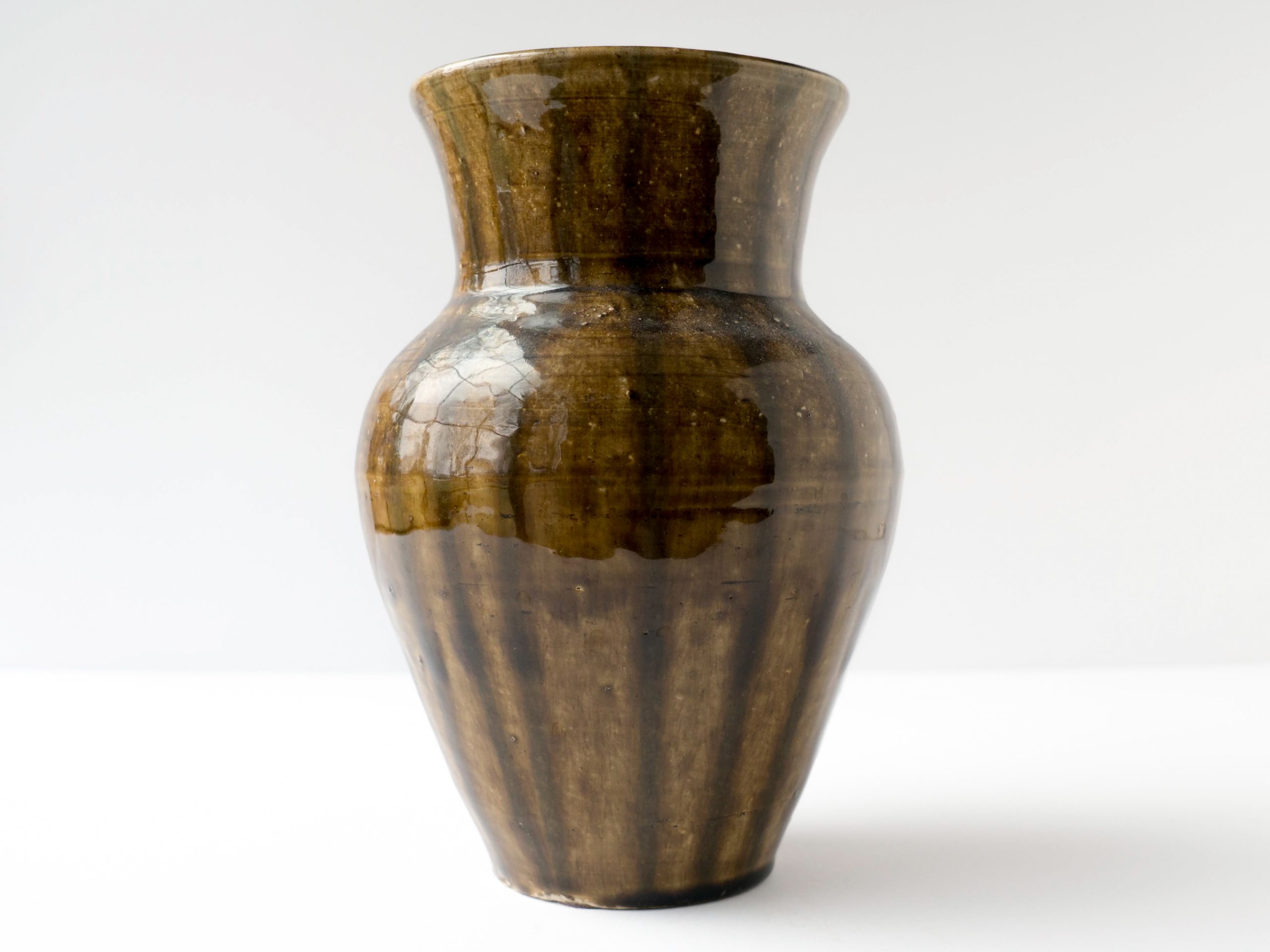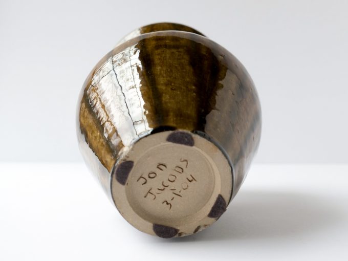 Vase wheel thrown in 2004. Brown glaze with striped design . Felt pads on bottom.